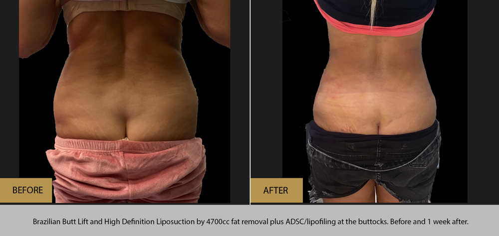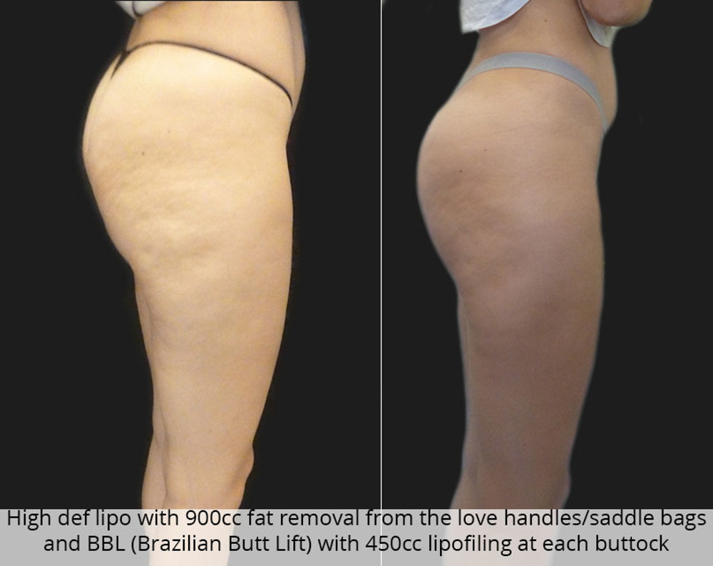 Μειώνοντας το λίπος στην μέση και την κοιλιά και αυξάνοντας το στην άνω/έξω επιφάνεια των γλουτών επιτυγχάνουμε εντυπωσιακά αποτελέσματα. Η ανόρθωση γλουτών γίνεται με λιποαναρρόφηση και λιπομεταφορά (Brazilian Butt Lift/BBL, https://www.ncbi.nlm.nih.gov/pmc/articles/PMC6212238/) αν και σε περιπτώσεις που δεν υπάρχει αρκετό λίπος μπορεί να συνδυαστεί με ενθέματα σιλικόνης ή Poly-L-Lactic Acid.