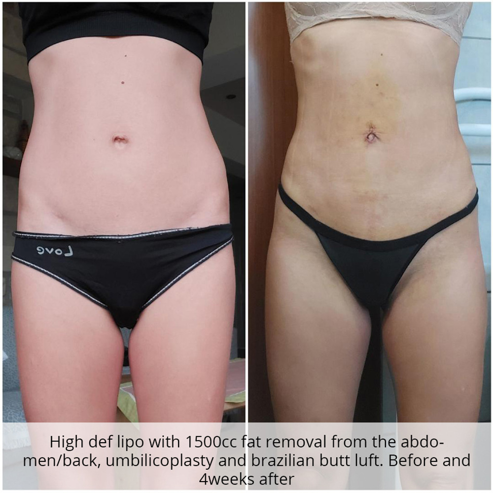 Για την μείωση του οιδήματος και την αποφυγή χαλάρωσης του δέρματος, οι ασθενείς θα πρέπει να φοράνε ειδικούς «κορσέδες» για 3-4 εβδομάδες μετά την επέμβαση ώστε οι ιστοί να πάρουν το τελικό τους σχήμα. Η επιστροφή στη δουλειά γίνεται σε 3-4 ημέρες, αν και υπάρχουν μώλωπες που εξαφανίζονται σε περίπου 2 εβδομάδες.